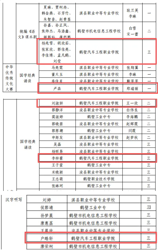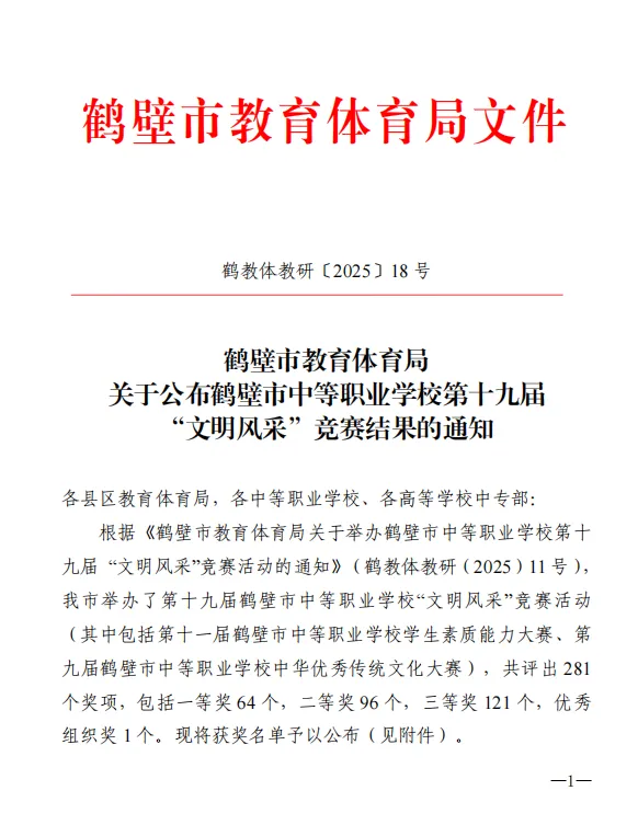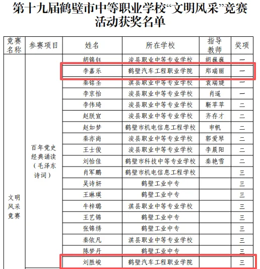 近日,由鹤壁市教育体育局主办的“鹤壁市中等职业学校第十九届文明风采”竞赛评选结果揭晓,学院19名学生的作品获奖,其中李嘉乐、卢森荣获一等奖,汪亚会、刘淑妍荣获二等奖,刘念、李冉、李梓豪等15名学生荣获三等奖。