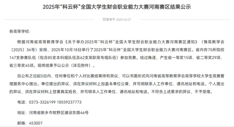 近日,2025年“科云杯”全国大学生财会职业能力大赛河南赛区圆满落幕。我院商学院大数据与会计、大数据与财务管理专业派出两支代表队参赛,由王冉、李美华、闫文玉、刘培玲组成的1队(指导教师:牛柯、王世玉),由赵玉乐、池煜轩、刘晴、苏欣宇组成的2队(指导教师:牛义霞、李尚洁),在与全省多所高校的激烈角逐中沉着应战、团结协作,最终双双斩获高职组三等奖,充分展现了我院学子精湛的专业技能与良好的综合素养。