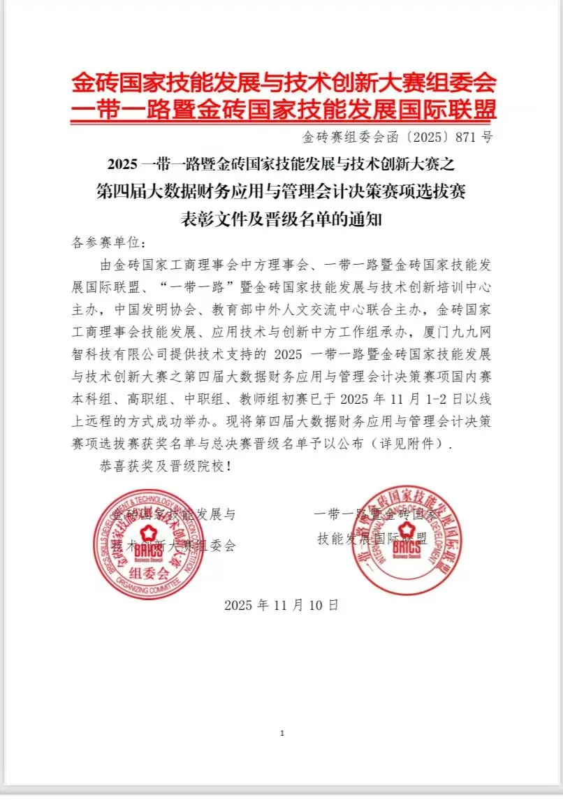 2025 一带一路暨金砖国家技能发展与技术创新大赛之第四届大数据财务应用与管理会计决策赛项选拔赛圆满落幕。我院商学院大数据与会计、大数据与财务管理专业派出两支学生队伍代表队参赛,由赵玉乐、郑皓、刘晴、苏欣宇组成的3队(指导教师:牛义霞、李尚洁),王冉、李美华、闫文玉、刘培玲组成的2队(指导教师:牛柯、王世玉),在与全国多所高校的激烈角逐中沉着应战、团结协作,最终双双斩获高职组三等奖,同时商学院教师赵燕利在教师组比赛中表现出色,荣获教师组三等奖并成功晋级全国赛。此次佳绩充分彰显了我院在大数据财务应用与管理会计领域的教学实力和育人成果。