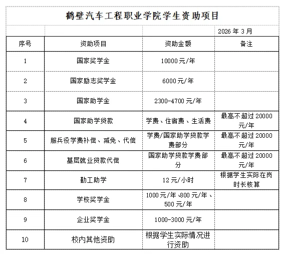 学校从事业收入中提取一定比例的经费,用于学费减免、校内奖助学金和特殊困难补助等。按照学校现有的规章制度,二年级及以上品学兼优的学生每学年通过申请、评审可以获得鹤壁汽车工程职业学院学校奖学金。学年奖学金分为三个等级:一等奖学金 1000 元/年;二等奖学金 800 元/年;三等奖学金 500 元/年。