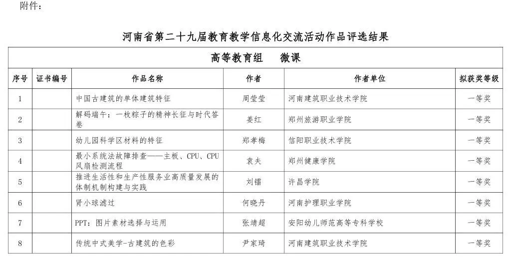 近日,由河南省教育厅主办的“河南省第二十九届教育教学信息化交流活动”评选结果揭晓,学院7名老师的作品获奖,其中燕雪宁、郑静茹、赵文娟、秦蕾老师的微课获二等奖;李勇、杜玉莉、李冉老师的微课获三等奖。
